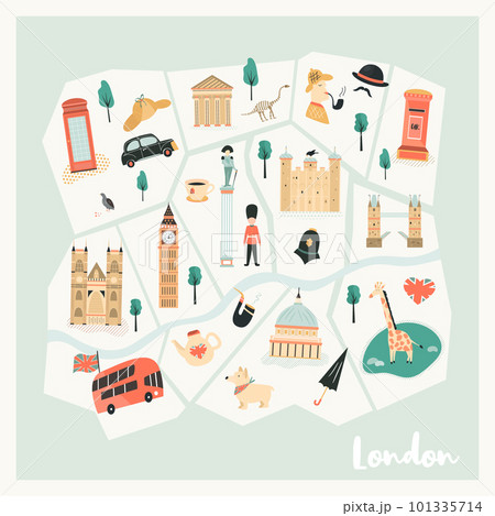 Illustrated map of London with landmarks, symbols