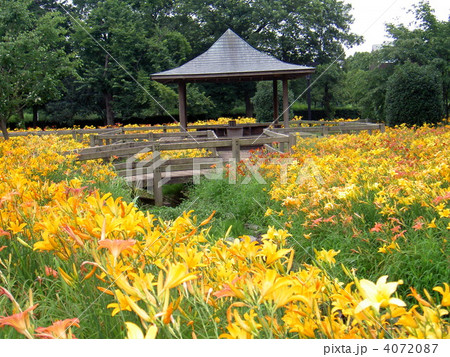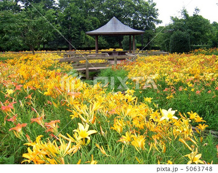 緑の中 美しい黄色い群生 キスゲの花 ネーブルパーク
