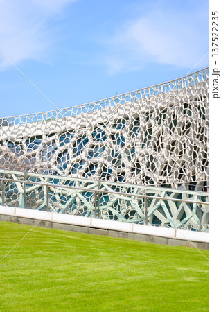 有機的な白いメッシュファサードと緑の芝生が映える現代建築
