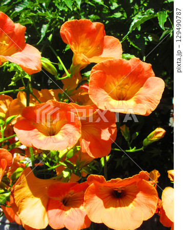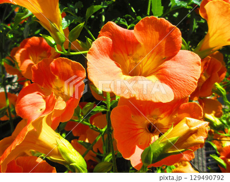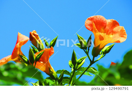 ノウゼンカズラのオレンジ色の花が咲いている夏の風景