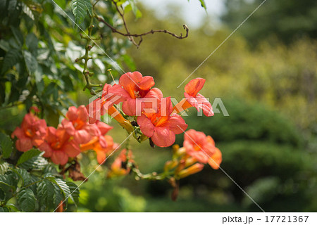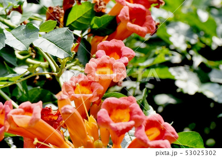 落葉性のつる性植物ノウゼンカズラの橙色の花