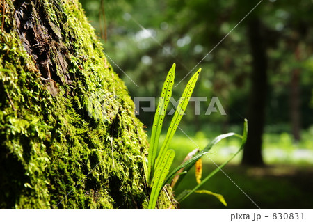 木洩れ日の自然 幹に射す陽と着床植物