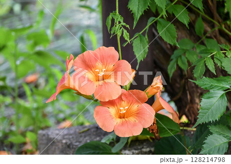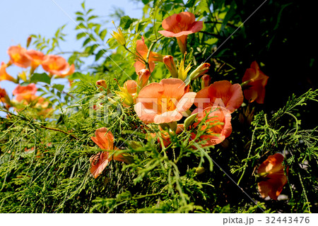落葉性のつる性植物ノウゼンカズラの橙色の花