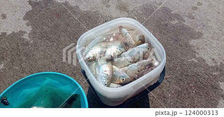 釣り場の風景バケツに魚だらけ