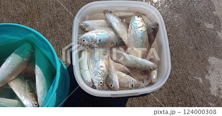 コノシロがいっぱいのバケツの釣り場風景