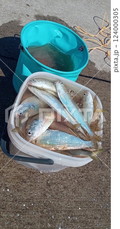 コノシロがいっぱいのバケツの釣り場風景