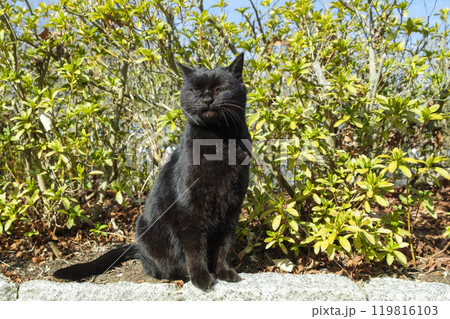 うららかな春日和に映える猫「座って、こちらを見ている猫」