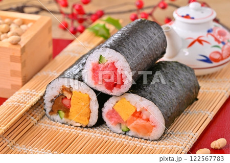 節分の恵方巻と福豆のイメージ。縁起物、厄除け、二月の行事。