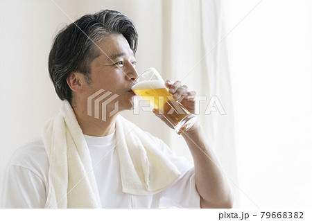 扇風機の前でビールを飲む50代の男性 お風呂上り イメージ