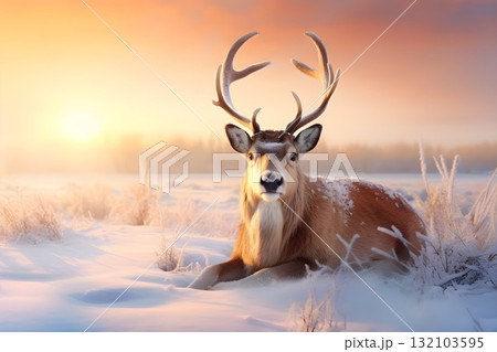 Wild reindeer with large antlers standing on snowy winter field, herd of majestic reindeer in cold Arctic landscape, traditional Christmas reindeer sleigh scene, wildlife nature background photo