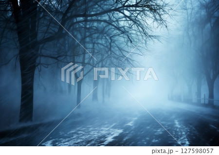 background of a winter snow covered road at night, beautiful landscape, dark winter forest, concept of travel and traffic safety on a slippery road