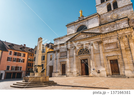 Architectural medieval historic of Notre Dame with Obelisk fountain and old town building in Annecy, France