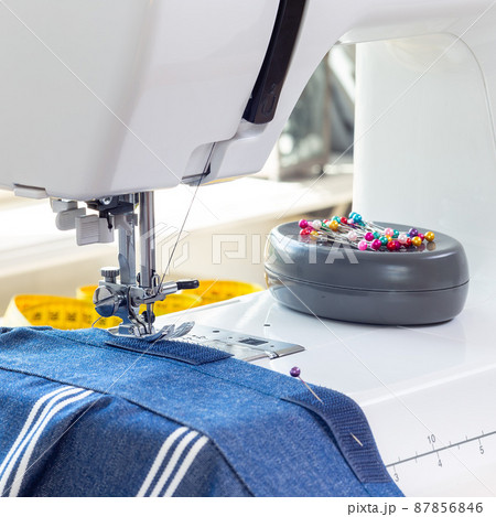 Sewing machine with striped blue white fabric and thread, pins on background, home crafting or hobby, horizontal