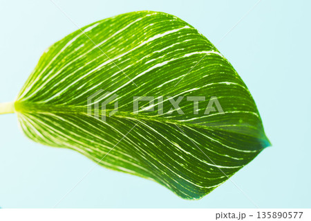 フィロデンドロンバーキンの葉を青背景でアップ撮影09