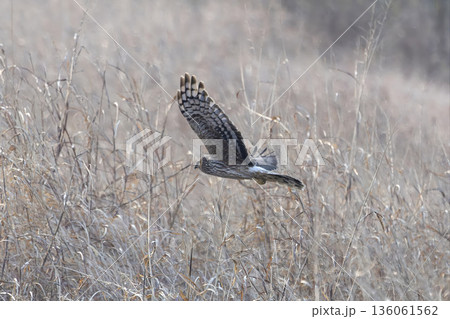 枯野を飛ぶハイイロチュウヒ