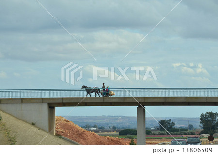 モロッコのハイウエーの横断橋を荷馬車で行く家族