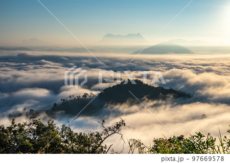 Majestic view of Doi Luang Chiang Dao in northern Thailand, the third highest mountain in Thailand, seen with beautiful dramatic clouds and colorful sky