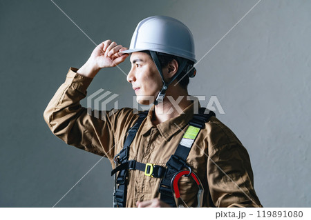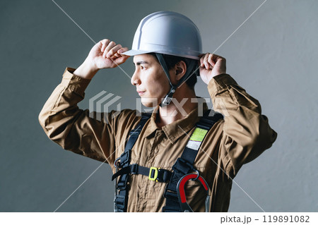 ヘルメットをかぶる男性作業員