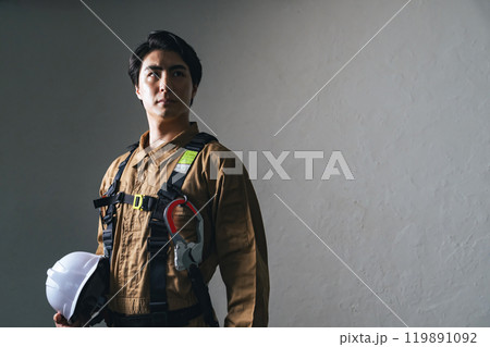 作業服を着てヘルメットを持つ男性作業員