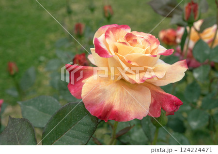 yellow and red rain-kissed hybrid tea roses in summer bed