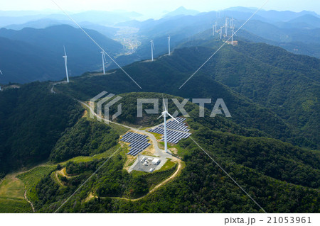 風車とソーラーパネルのハイブリッド発電所の風景空撮