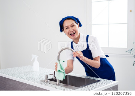 キッチンを掃除するシニア女性のハウスキーパー
