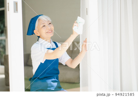窓拭きをするハウスキーパーのシニア女性