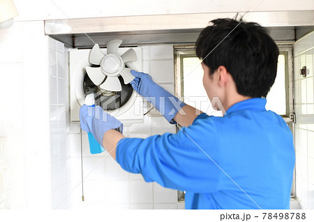 換気扇の掃除をする清掃業の作業服の若い男性