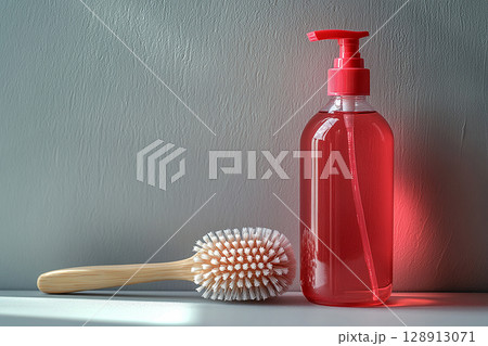 Brand friendly. Brush next to a red detergent bottle on a light background. Commercial use. Product Styling. Shiny surfaces.