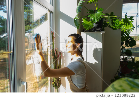 Woman in apron manually washes the window of house with rag cleaner and mop inside the interior with home plants on windowsill. Restoring order and cleanliness in the spring, cleaning servise
