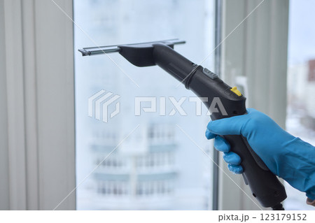 Young man cleans the windows in the house. He splashes detergent, rubs and removes water at the glass