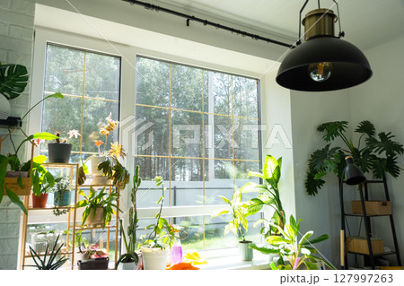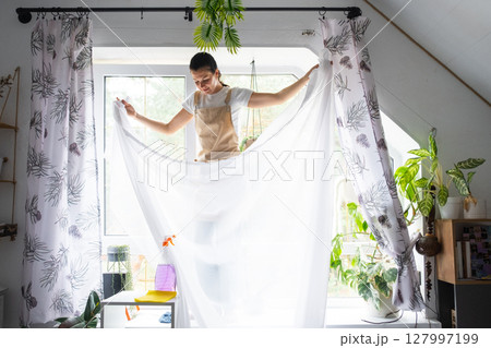 Woman in apron hangs transparent tulle curtains on large attic windows in the house inside the interior with potted plants. Spring cleaning, tidying up