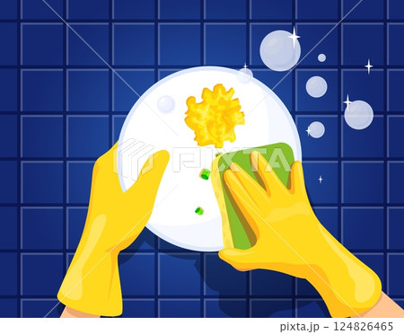 Hands wash dish. Hand in yellow gloves with sponge washing clean dirty dishware, kitchen household cleaner work cleanliness hygiene concept cartoon vector illustration