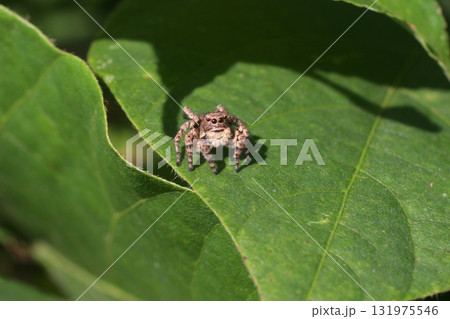 葉の間に身を隠すハエトリグモ(ネコハエトリ)