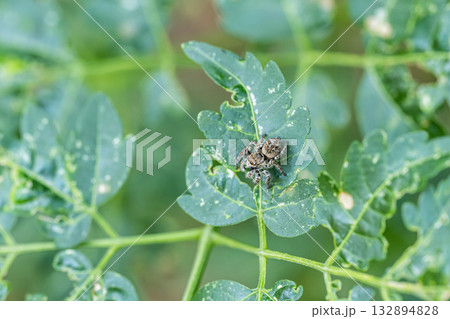 Thyene inflata on green plant leaves. The two-striped jumper, or Telamonia dimidiata, is a jumping spider found in various Asian tropical rain forests, in foliage in wooded environments. mopsus mormon