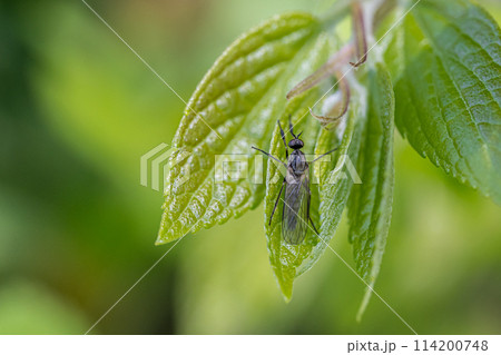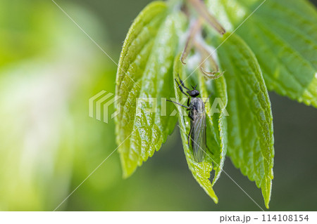 葉の上にいるヒゲナガヒロクチバエ