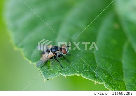 葉の上にいるミドリバエ