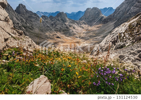 ハクサンシャジン咲く登山道から見る夏の朝日連峰主稜線