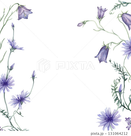 Square border or frame with blue wildflowers. Hand drawn watercolor illustration on isolated background. Summer floral pattern for frame or banner with chicory and bluebell and Mouse Pea Flowers.