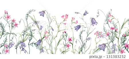 Seamless horizontal border or banner with pink purple wildflowers. Hand drawn watercolor illustration on white isolated background. Summer floral pattern for frame or banner with blue bluebells.