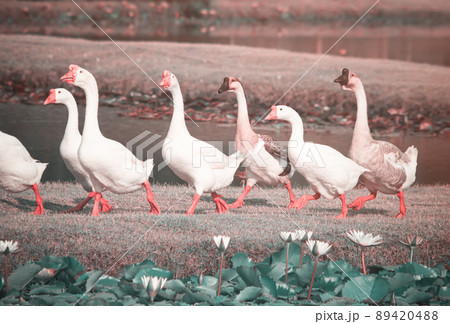 A large flock of graceful white swans swims in the lake., swans in the wild