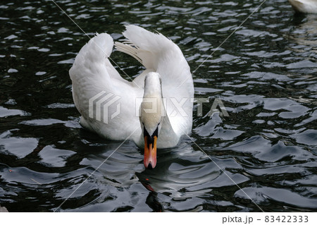 Graceful white Swan swimming in the lake and flaps its wings on the water.