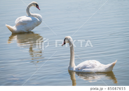 Two Graceful white Swans swimming in the lake, swans in the wild