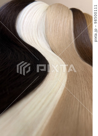 Strands of natural hair in different colors for extensions with tools. Hair color palette.