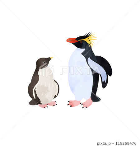 キタイワトビペンギンの雛と成鳥。水彩風イラスト。