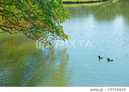 旧古河庭園のハゼノキの紅葉と湖面に映える景観