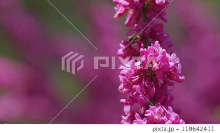 Bees Harvesting Pollen From Pink Judas-Tree. European Cercis Or European Scarlet. Close up.