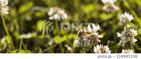 Honey bee collecting nectar on clover blossom. Pollination. Environmental concept, saving the bees concept