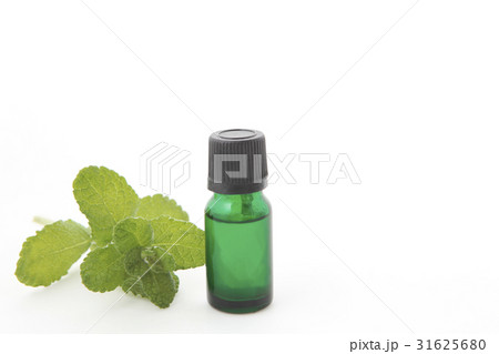 ミントとアロマオイルの瓶を白背景で撮影