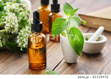 Bottle of mint essential oil and peppermint leaves. Mortar of spearmint leaves and blossom Mentha piperita medinal plants on background.